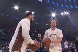 赛前投篮热身时,库里和波杰姆斯基持球相碰,然后再进行投篮。