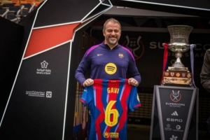巴萨主帅弗里克手拿加维球衣与西超杯奖杯合影,他在加泰德比之前就曾拿加维的球衣与西班牙人主帅合影,最终巴萨客场2-0取胜。