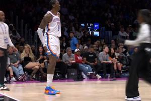 在下半场,雷霆官方宣布杰伦威右大腿酸痛,不会回归。