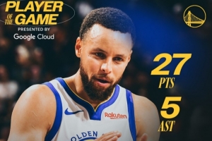 本场比赛,库里出战28分钟,15中8,三分12中5,罚球7中6,砍下27分2板5助1断。