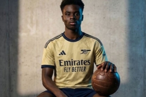 阿森纳2026-27赛季第二客场球衣以浅黄色为主色调,海军蓝为辅助色,用于标识、镶边及图案细节。