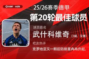 第20轮评选结果出炉,18岁热刺外租小将武什科维奇破门,攻防两端发挥俱佳,帮助汉堡逼平拜仁。武什科维奇当选【体育资讯X小红书德甲第20轮最佳球员】!