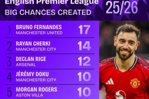 体育资讯2月10日讯 数据机构squawka统计了本赛季英超创造重大机会情况,曼联队长B费领跑。