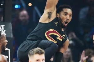 骑士球星米切尔上半场频繁冲杀内线砍分,他出战15分半钟,9投3中(三分3中1)、罚球9中8,砍下15分1助攻2抢断,有2次失误,正负值-3。