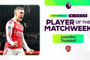 英超官方写道:“阿森纳前锋特罗萨德当选英超第19轮周最佳球员。”