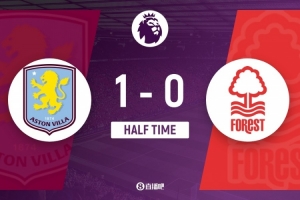 伤停补时1分钟。上半场比赛结束,阿斯顿维拉1-0诺丁汉森林。
