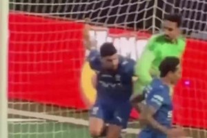 关键!安以恩获良机推射被阿尔瓦罗封堵,王大雷与后者激动拥抱