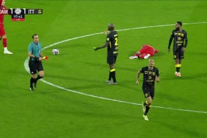 布尔克上抢后叶博亚倒地,裁判无表示,VAR认定不是点球
